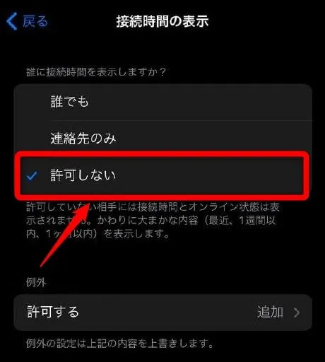 この「許可しない」設定にすると、「オンライン」以外の状態の時は、