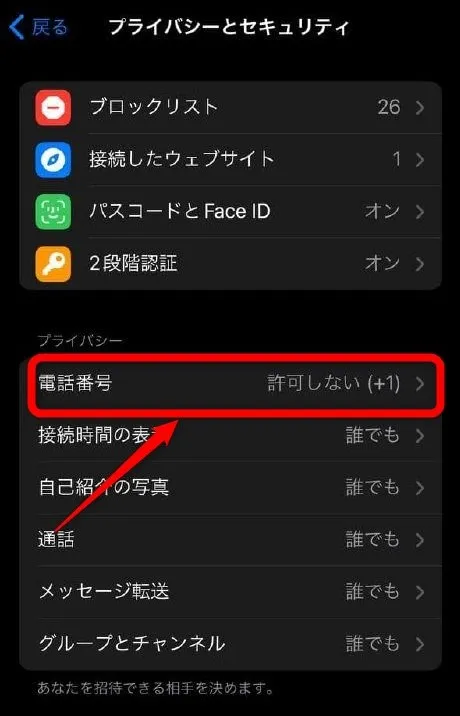 誰と電話番号で繋がりますか?項目から「許可しない」を選択